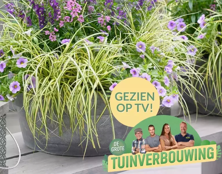In het SBS6-programma De Grote Tuinverbouwing geven Ivo en het team elke week een tuin in nood een fikse make-over. Ook voorzien ze de kijker van inspiratie en tips om huis en tuin naar een groener level te tillen. Wist u dat alle planten die in het programma worden gebruikt ook in ons tuincentrum in Bergambacht te koop zijn? U vindt ze na uitzending in het speciale vak op de plantenafdeling.