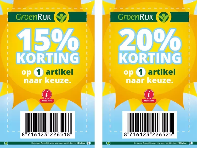 - De 15% en 20% keuzekortingsbonnen zijn geldig van 20 t/m 26 juli 2022 bij alle GroenRijk tuincentra (niet in de webwinkels).