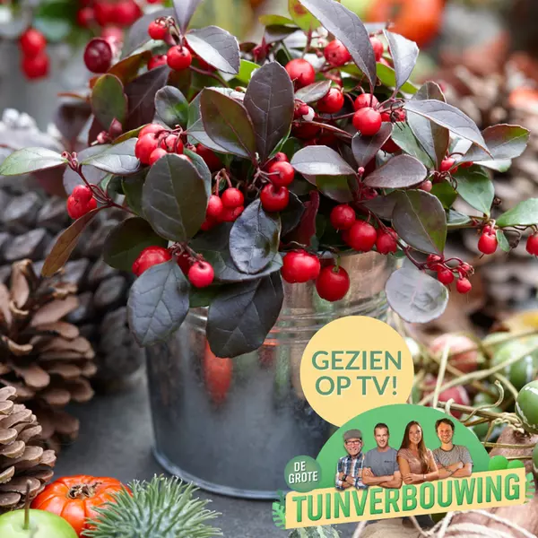Voor dieren zijn de bessen van de ‘Big Berry’ niet aantrekkelijk om te eten, wat betekent dat u het hele bloeiseizoen plezier heeft van deze felrode kleur. Naast dat de Gaultheria een zeer sterke bodembedekker is, is deze plant ook geschikt als terrasaankleding. Zet de Gaultheria in een pot of mix de ‘Big Berry’ met andere winterse planten in een mand tot een schitterende planten coupe voor op de buitentafel.