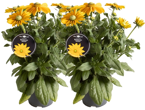 De bloemen van de gele zonnehoed of Rudbeckia hebben vaak gele, stralende bloembladeren rond een kleurig hart. Oorspronkelijk groeien de verschillende wilde Rudbeckia-soorten vooral in Noord-Amerika. De compact en gelijkmatig groeiende Rudbeckia hirta-soorten worden vaak gekweekt om één jaar in tuinen te shinen, maar na een zachte winter kunnen ze ook gewoon weer uitlopen. Deze Rudbeckia hirta 'Sunbeckia Ophelia' heeft veel vertakkingen en extra grote, intens donkergele straalbloemen rondom een groengeel hart. De bloemen blijven in de zomer wel zes weken lang bloeien!